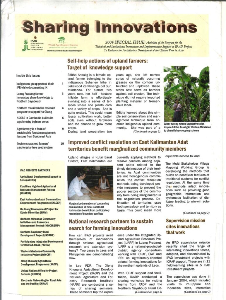 UN IFAD projects in Southeast Asia realized that there were major gaps in agroforestry knowledge between the science world and IFAD project intervention teams (Department of Agriculture and Department of Environment) in the field. The Newsletter above chronicled the various interventions that ICRAF provided (I was part of the SEA team). On hindsight, I realize that institutional capacity building (Agri and Environment Agencies) is a long term “inter-generational “process because government officers are products of compartmentalized technical education. Thus, the transformation process cannot be handled by one project alone. It may take on the minimum, three to five “back to back “ projects. One has to also invest in the school system.