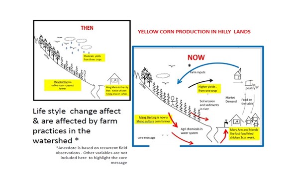 - Traditional upland corn farming is giving way to labor friendly GMO corn production using powerful herbicides that indirectly lead to soil erosion and affect water quality. Large swathes of corn belts in hillsides exist in upland landscapes such as in Sierra Madre, Panay and Northern Mindanao.