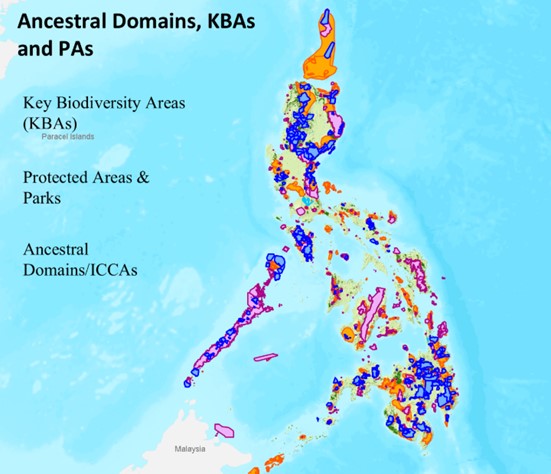 Case 1: Large Portions of Key Biodiversity Areas (KBAs) are not covered by Protected Areas. But on the ground, many indigenous upland communities maintain customary rules and practices that also conserve biodiversity. The CBD convention recently gave this more emphasis (as Other Effective Conservation Mechanisms). This was also partly a result of studies by the IPBES (Intergovernmental Science Policy Platform on Biodiversity and Ecosystems Services) Such is the case in the Philippines (reference: map from PAFID/Dave de Vera showing the overlap of KBAS. PAs and Ancestral Domains)