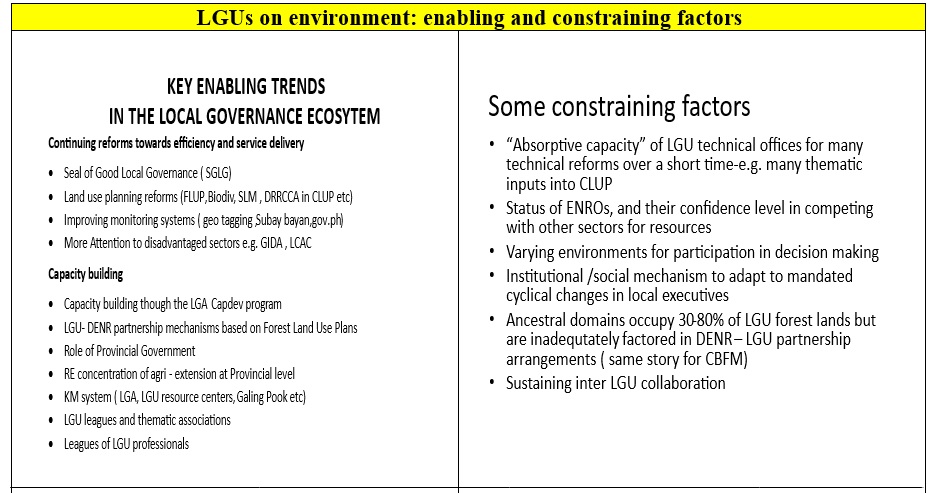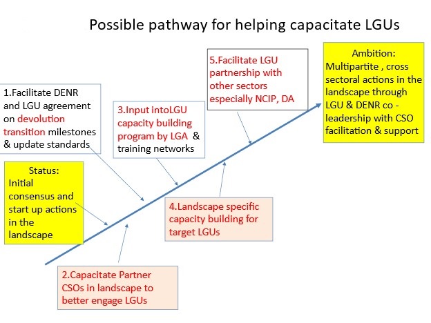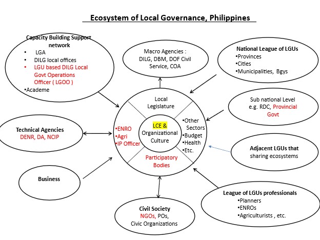Above is the ecosystem of local environmental governance, with the LGU in the center stage. Within the LGU are key bodies that require differentiated capacity building. The LGU can respond to both vertical and horizontal signals coming from National Agencies, and peer LGUs, community organizations, among others Capacity building can come from different directions. In recent years, peer to peer knowledge sharing among LGUs are promising capacity building modalities. (Ref. this was shared with the Forest Foundation of the Philippines as part of support to the direction on engaging LGUs.)