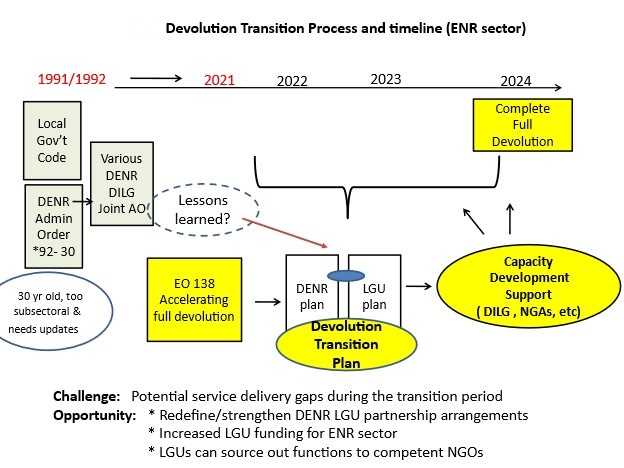 Timeline of milestones that relate to LGUs on environmental issues. There was a brief window (2016- 2022) that tried to accelerate the devolution process. However, this has been suspended.